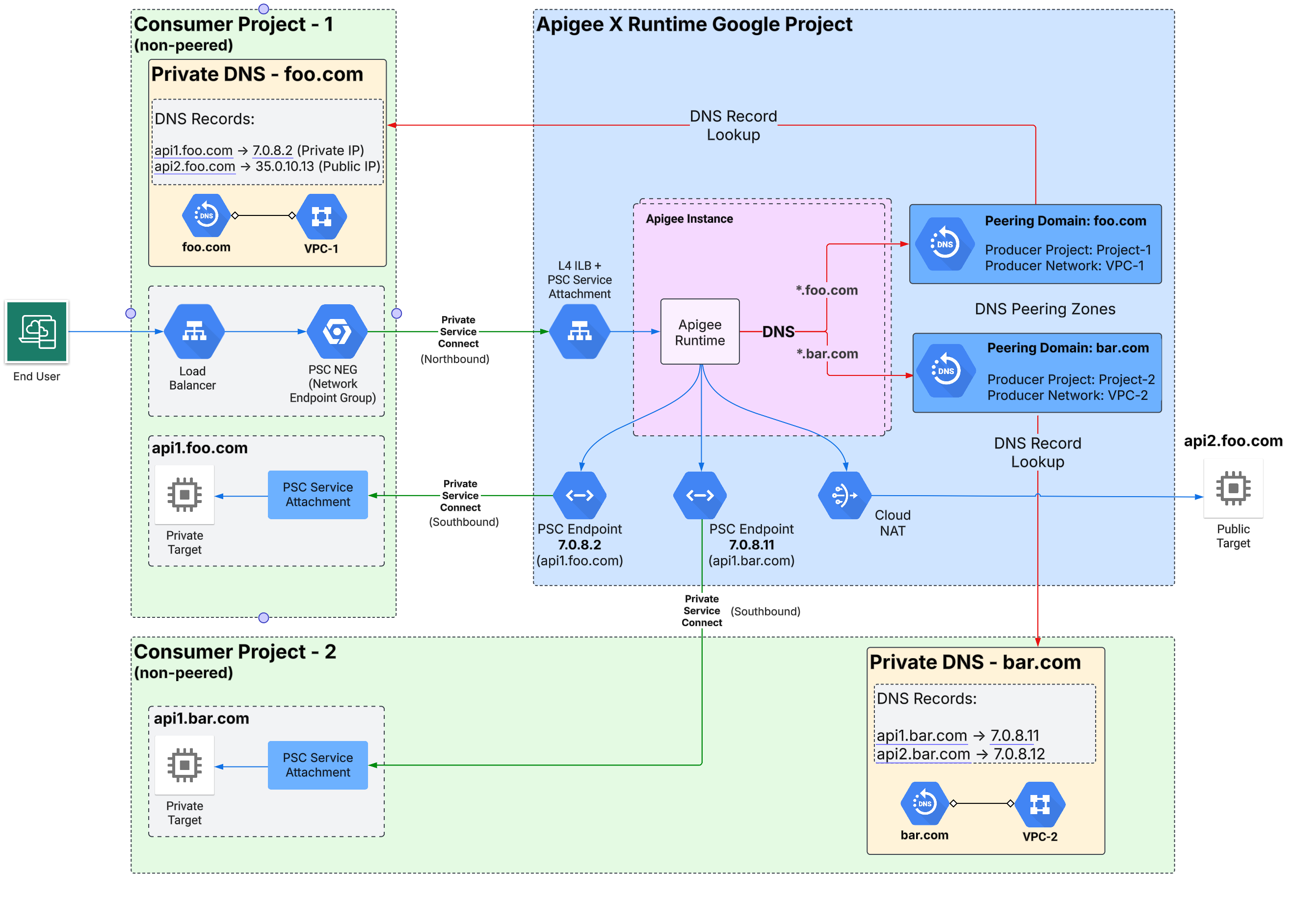 Para realizar su trabajo, Apigee necesita conectarse a los destinos de backend que administras. Estos destinos se pueden resolver a través de un DNS público o privado. Si el destino se puede resolver públicamente, no hay ningún problema, ya que el destino de backend de Apigee apunta a la dirección pública del servicio. Los extremos privados pueden ser direcciones IP estáticas o nombres de DNS que se pueden resolver y que tú alojas y administras. Para resolver los extremos de destino privados, es común mantener una zona DNS privada alojada en tu proyecto de Google Cloud. De forma predeterminada, Apigee no puede resolver estos nombres de DNS privados.