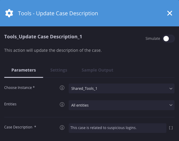 | Zuweisen zu | String | @Admin | Ja | Geben Sie den Nutzer an, dem der Fall zugewiesen werden soll. Das ist die ID des Nutzers. Verwenden Sie die Aktion „Get Siemplify Users“ (Siemplify-Nutzer abrufen), um die ID für einen bestimmten Nutzer abzurufen. |