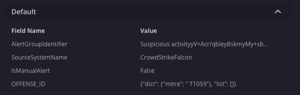 { "wallData": [{"commentForClient": null, "comment": null, "modificationTimeUnixTimeInMsForClient": 0, "creatorUserId": "8f8er8d6-ee8b-478e-9ee592-cc27e9addda13b", "id": 6357, "type": 5, "caseId": 36902, "isFavorite": false, "modificationTimeUnixTimeInMs": 1680717397165, "creationTimeUnixTimeInMs": 1680717397165, "alertIdentifier": "SUSPICIOUS ACTIVITY991C7837-1EE9-4EEA-AE7B-975366CA2EAE"}, {"actionTriggerType": 0, "integration": "Tools", "executingUser": null, "playbookName": "New Playbook", "playbookIsInDebugMode": true, "status": 5, "actionProvider": "Scripts", "actionIdentifier": "Tools_Get Case Data_1", "actionResult": "Action started", "alertIdentifiers": ["SUSPICIOUS ACTIVITY991C7837-1EE9-4EEA-AE7B-975366CA2EAE"], "creatorUserId": null, "id": 7677, "type": 3, "caseId": 0, "isFavorite": false, "modificationTimeUnixTimeInMs": 1680717397401, "creationTimeUnixTimeInMs": 1680717397401, "alertIdentifier": null}], "alerts": [{"ticketId": "d21ebvcxzb88-35vc35-46b4-9edd08-063696d7cc092", "status": 0, "identifier": "SUSPICIOUS ACTIVITY991C7837-1EE9-4EEA-AE7B-975366CA2EAE", "hasWorkflows": true, "workflowsStatus": 1, "sourceSystemName": "CrowdStrikeFalcon", "securityEventCards": [{"caseId": 36902, "eventId": "5fde7844-0099-4c5d-a562-63e2d0deb7e5", "alertIdentifier": "SUSPICIOUS ACTIVITY991C7837-1EE9-4EEA-AE7B-975366CA2EAE", "eventName": "CustomIOAWinLowest", "product": "Falcon", "sources": [{"isValid": true, "identifier": "172.30.202.229", "type": "ADDRESS"}, {"isValid": true, "identifier": "EXLAB2019-AD", "type": "HOSTNAME"}, {"isValid": true, "identifier": "E019-AD$", "type": "USERUNIQNAME"}], "destinations": [], "artificats": [{"isValid": true, "identifier": "MPCMDRUN.EXE", "type": "FILENAME"}, {"isValid": true, "identifier": "60D88450B376694DC55EB8F40B0F79580D1DF399A7BDF", "type": "FILEHASH"}], "port": null, "outcome": null, "time": "2023-03-01T19:51:00Z", "deviceEventClassId": "Indicator of Attack", "fields": [{"isHighlight": true, "groupName": "HIGHLIGHTED FIELDS", "hideOptions": false, "items": [{"originalName": "startTime", "name": "Start Time", "value": "1680615463369"}, {"originalName": "endTime", "name": "End Time", "value": "1680615463369"}]}, {"isHighlight": false, "groupName": "Default", "hideOptions": false, "items": [{"originalName": "cid", "name": "cid", "value": "27fe4e4760b8476b2b6650e5a74"}, {"originalName": "created_timestamp", "name": "created_timestamp", "value": "2023-03-01T19:51:11.387187948Z"}........................ }