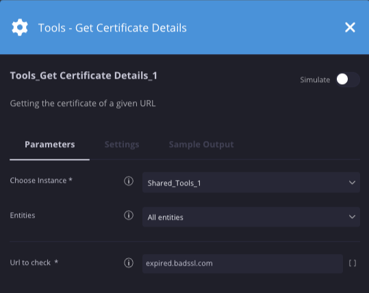 | Zu prüfende URL | URL | expired.badssk.com | Ja | Geben Sie die URL an, von der Zertifikatdetails abgerufen werden sollen. |