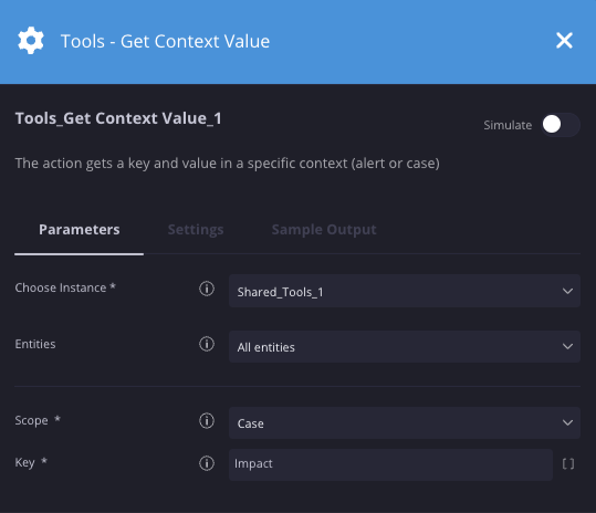 In diesem Szenario rufen wir einen Kontextwert aus einem Schlüssel namens „impact“ in einem Fall ab. Diese Aktion wird zusammen mit der Aktion „Kontextwert festlegen“ verwendet, mit der dem Fall oder der Benachrichtigung die Schlüssel/Wert-Paare hinzugefügt werden.