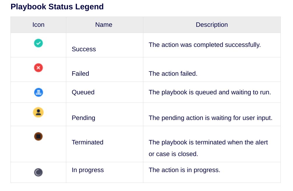 Os ícones a seguir aparecem na guia Casos > Playbooks quando um playbook é anexado.