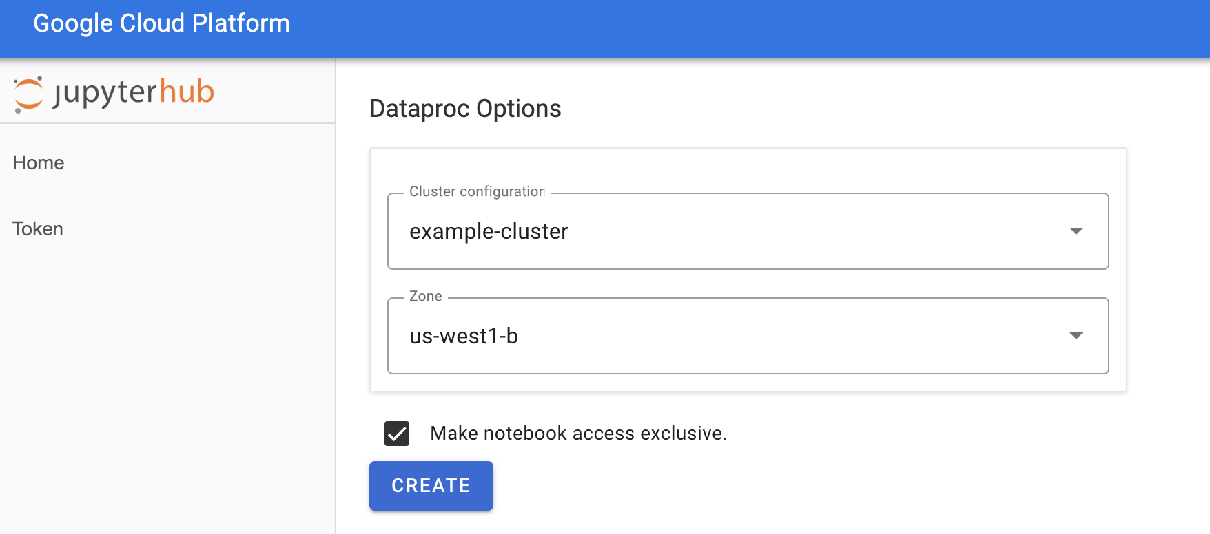 在「Jupyterhub→Dataproc Options」(Jupyterhub→Dataproc 選項) 頁面中,選取叢集設定和區域。如果啟用,請指定任何自訂項目,然後按一下「建立」。