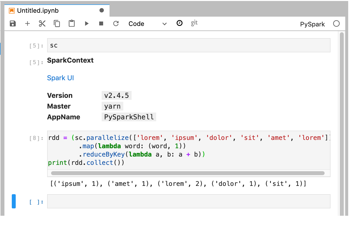 sc變數)。您可以檢查 SparkContext,並從筆記本執行 Spark 工作。rdd = (sc.parallelize(['lorem', 'ipsum', 'dolor', 'sit', 'amet', 'lorem']) .map(lambda word: (word, 1)) .reduceByKey(lambda a, b: a + b)) print(rdd.collect())