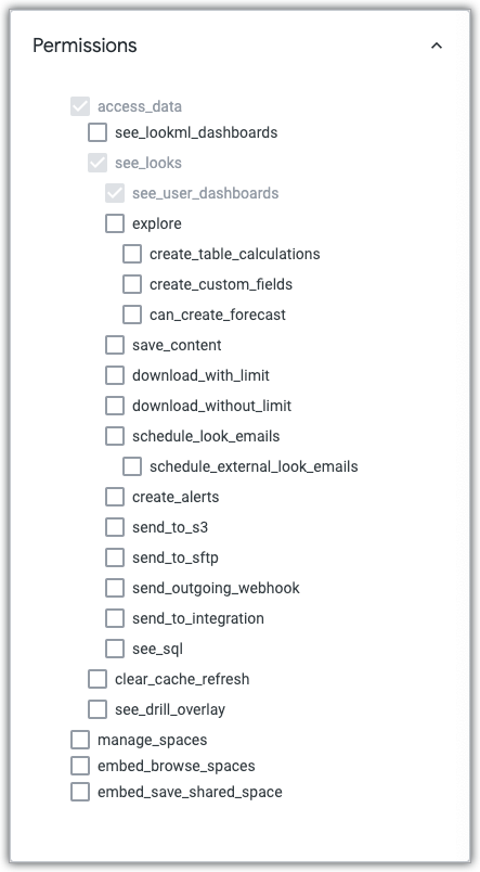 ユーザーが埋め込みコンテンツを表示するために必要な最小限の権限がデフォルトで選択されています。ユーザーに追加の権限を付与するには、[権限] フィールドをクリックして展開し、ユーザーに付与する追加の権限を選択します。