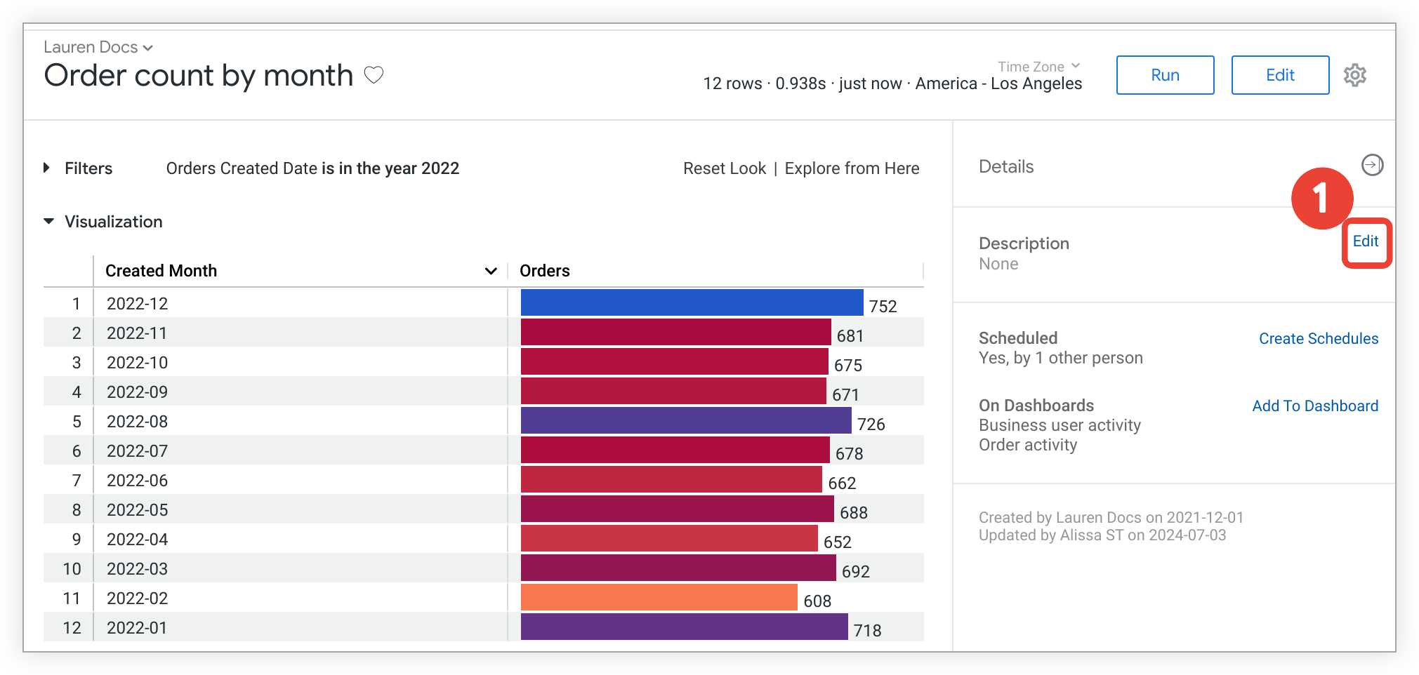 저장된 Look 페이지에서 다음 단계에 따라 저장된 Look의 필드, 필터, 시각화, 정렬 등을 수정할 수 있습니다.