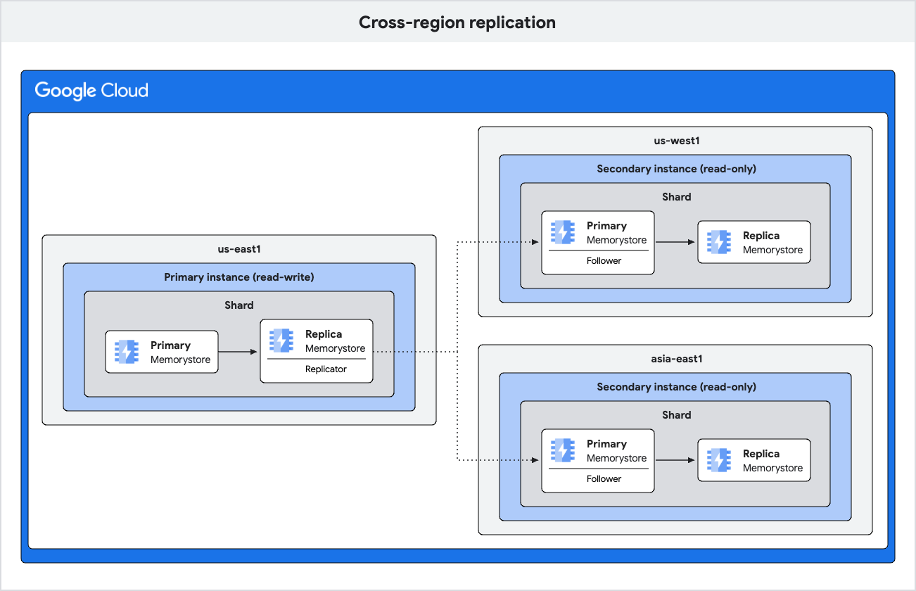 - 料金: Memorystore for Valkey は、リージョン間レプリケーションに使用するお客様に対して、リージョン間レプリケーション用に Memorystore for Valkey がプロビジョニングするセカンダリ インスタンスの料金を請求します。Memorystore for Valkey がセカンダリ インスタンスにデプロイするノードとレプリカごとに、他のプライマリ インスタンスと同様に課金されます。また、異なるリージョンのインスタンス間でデータを転送すると、ネットワーク料金が発生します。